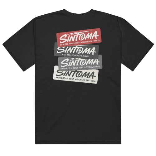 Camiseta de señal frontal con wordmark SINTØMA en pecho—Ø con rayo centrado y speed-lines como trazo de impacto. Silueta urbana, limpia y brutalista: transmite el código de la marca sin ruido extra.